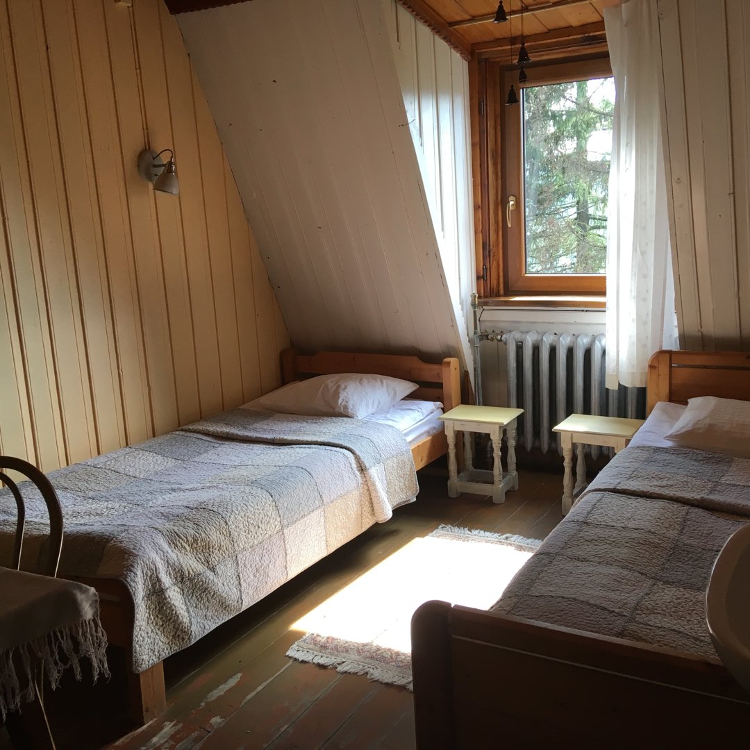 Klimatyczny pokój na pierwszym piętrze w stylu starych lanckoronskich willi, ściany pokryte drewnianą boazerią, kącik z umywalką, dwa łóżka pojedyncze, szafa w stylu zakopiańskim z lat 70 - tych, stolik i krzesła. Okna na południową stronę z widokiem na góry i ogród. Na prośbę gości bezpłatne ręczniki. Toalety i łazienki z prysznicami na tym samym piętrze.